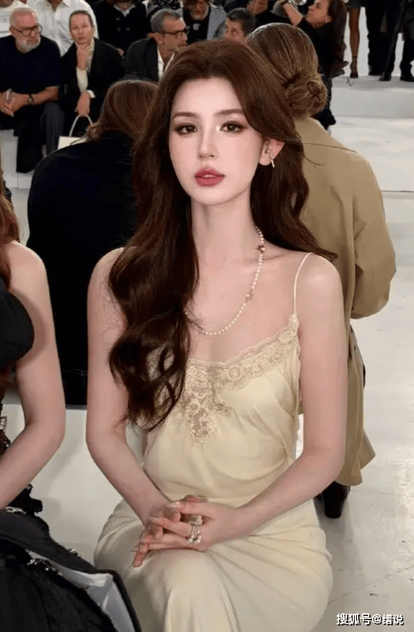 她的造型完美诠释了Prada的“原始优雅”主题,通过0.3厘米微包边、提高2.5厘米腰线、前短后长下摆等精妙剪裁,在众多深色系着装中脱颖而出。